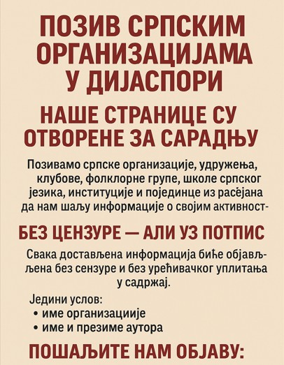 Овим путем позивамо све српске организације, удружења, клубове, фолклорне групе, школе српског језика, институције и појединце из региона и дијаспоре да нам се јаве и да своје активности учине видљивим.