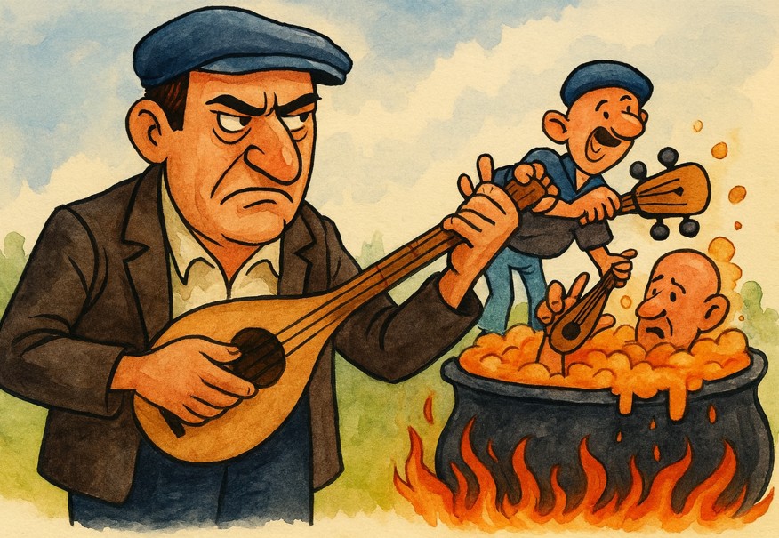 Кипи све јаче, пена избија, казан се тресе, а шаргијаш, уместо да пази да не загори, бацио се на оптужнице. Дегустатори, један по један, клизе у лонац, што од смеха, што од клизаве политике. И ту долазимо до главне поуке: шаргија није срушила ниједан град, ни труба није оборила ниједну кућу, ни гусле нису пореметиле грађевински план.